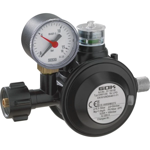 Der Gasdruckregler EN61-DS PRO von GOK eignet sich zum Anschluss an Gasflaschen, speziell für den Betrieb von Gasgrills. Er ist mit einer Überdruck-Sicherheitseinrichtung S2SR (ÜDS) zur Absicherung der Verbrauchsgeräte vor zu hohem Druck ausgestattet, sowie mit einer Sichtanzeige (grün/rot) und einem optischem Signal (rot) bei Ausgangsdrücken über 80 mbar. Das Manometer eignet sich zur Dichtheitsprüfung z.B. beim Flaschenwechsel. Es handelt sich um die Ausführung mit verlängertem Eingangsstutzen, zur problemlosen Montage z.B. an Barbeque-Gasflaschen mit Kragen.Art.-Nr.: 1650868