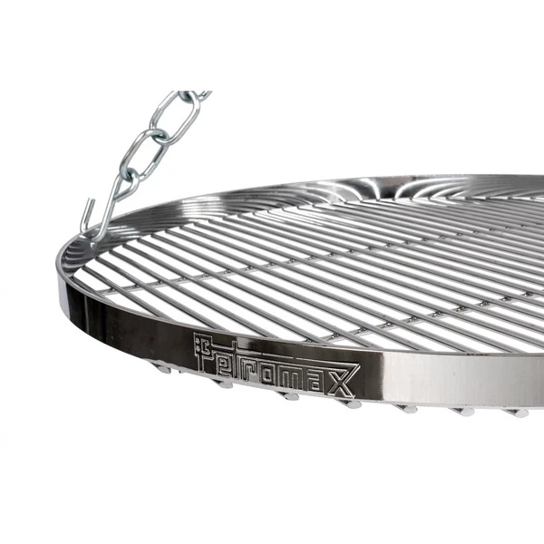 Mit dem Hänge-Rost h-grate50 für das Petromax Dreibein wird auf ursprüngliche Art Fleisch und Gemüse direkt über dem Feuer gegrillt. Dabei nehmen Steaks, Filet und anderes Grillgut die Aromen des Holzfeuers auf, bleiben gleichzeitig aber besonders saftig. Denn der an drei Ketten aufgehängte Grillrost aus verchromtem Stahl pendelt stets leicht über der Feuerstelle, so wird das Grillgut wie bei einem Schwenkgrill schonend zubereitet. Auch die Optik überzeugt, da der Rost das typische Grillmuster auf die Mahlzeit zaubert. Der Hänge-Rost wird an dem Dreibein-Haken sicher eingehängt. Zusätzlich schützt der erhöhte Rand vor Wegrollen von z.B. Bratwürsten. Mit einem Durchmesser von gut 50cm bietet der Rost ausreichend Platz, um den Hunger zu stillen. Der Abstand zum Feuer kann über die Kette genau passend reguliert werden, so wird das Dreibein (nicht im Lieferumfang enthalten) mit dem Hänge-Rost zur leistungsstarken Draußen-Kochstelle für jede Gelegenheit.Art.-Nr.: 1691475